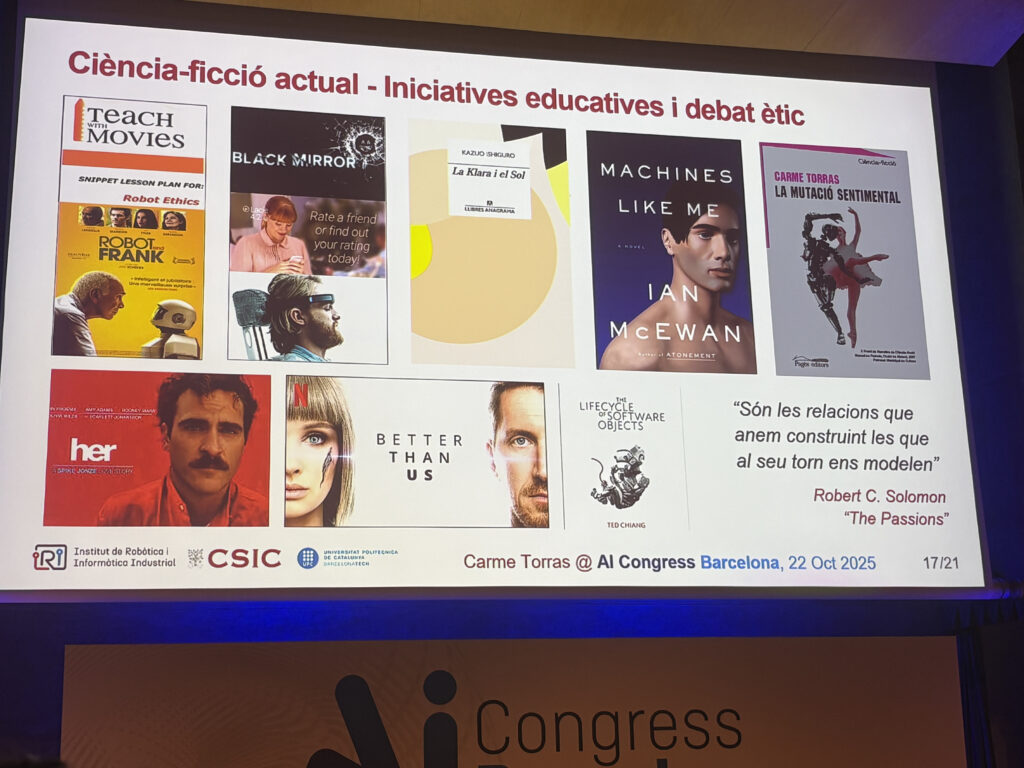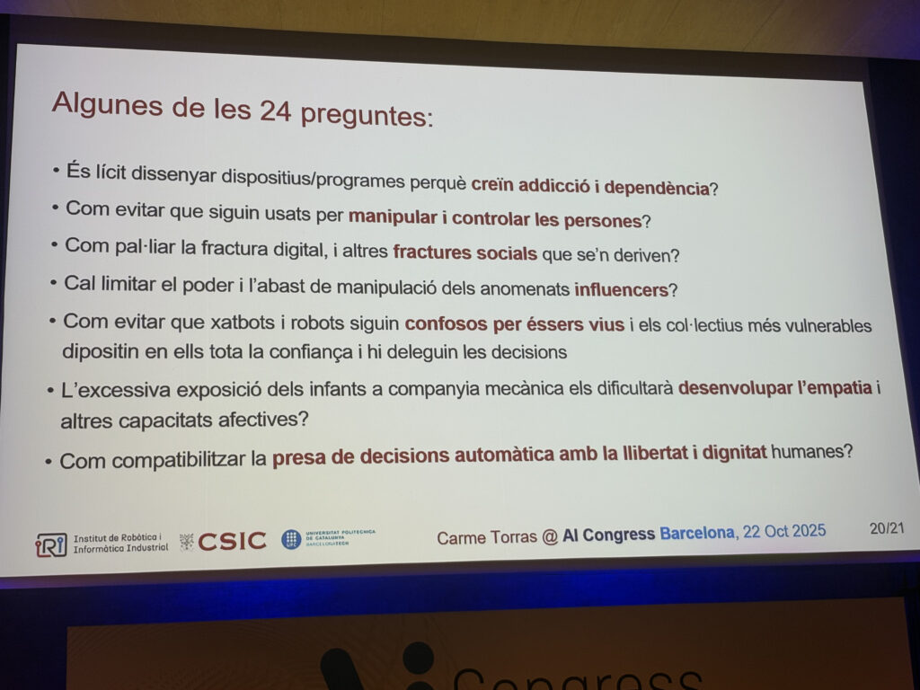 Després d’un matí ple de sigles i arquitectures, va ser un respir veure reconeguda la trajectòria de Carme Torras, de l’Institut de Robòtica i Informàtica Industrial (UPC-CSIC). Va presentar un projecte d’aquells que recorden per què fem tot això: robots assistencials capaços d’ajudar pacients hospitalaris a menjar sols. Una recerca que combina tecnologia, empatia i utilitat social, tres paraules que, sincerament, no sempre van juntes en aquest sector. A més ens va mostrar la seva faceta d’escriptora i divulgadora sobre ètica robòtica i tecnologia, a part de recomanar-nos llibres i pel·lícules!